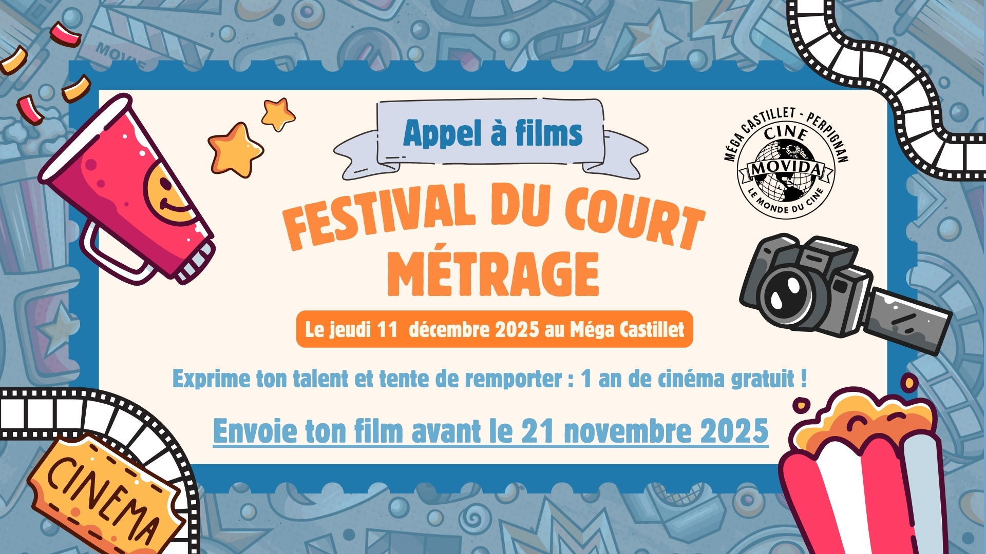 Le Cinéma Méga Castillet de Perpignan est heureux d’annoncer la troisième édition de son Festival du Court-Métrage, qui se tiendra le jeudi 11 décembre 2025 à 19h30. Fort du succès rencontré lors des deux précédentes éditions, l’événement revient pour une nouvelle soirée dédiée à la créativité, au partage et à la passion du cinéma. Ce rendez-vous annuel est devenu un moment incontournable pour tous ceux qui aiment raconter des histoires à travers l’image, qu’ils soient amateurs, étudiants ou cinéastes confirmés.